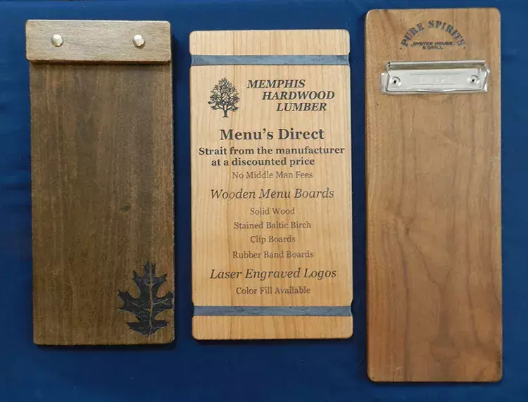 When you order one of our elegant wood menus, you’re getting it direct from the manufacturer at a discounted price. By doing this, you avoid the hassle of using a middle man, meaning you save more money in the long run. All of our wooden menu boards are solid wood with your choice of wood and finish. We also offer clipboards, rubber band boards, table toppers, and check presenters. All of these items can be laser engraved with your logo and a choice of fill colors. Call us today to order.